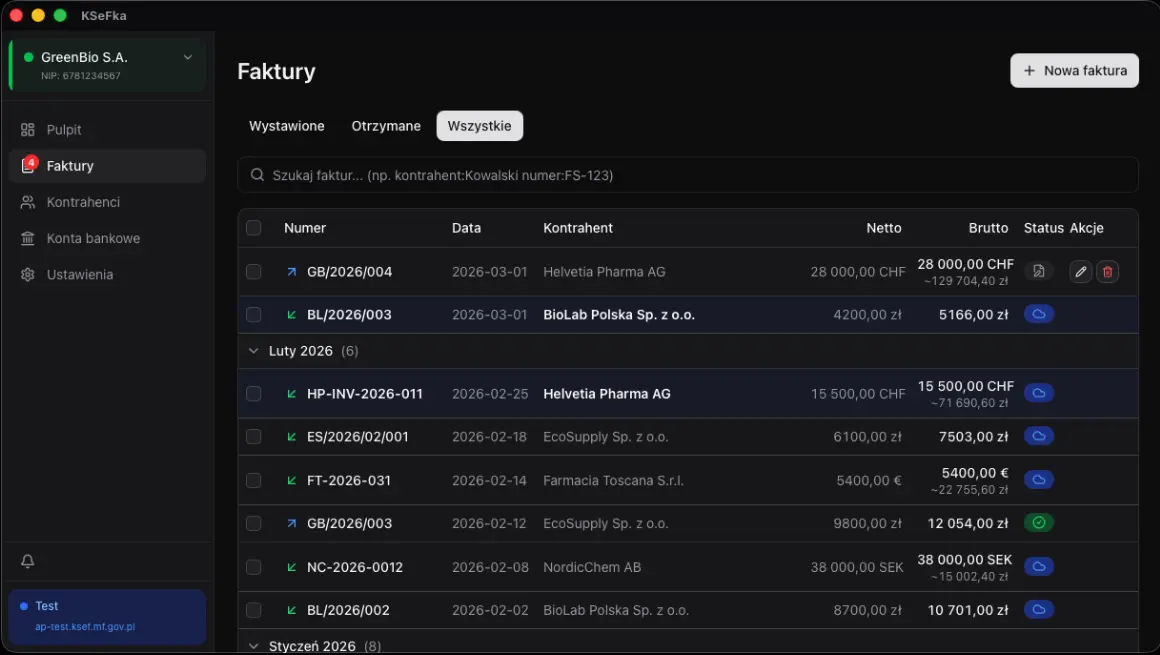 Desktopowa aplikacja do fakturowania z KSeF. Wystawiaj, odbieraj i synchronizuj faktury. Lokalnie, offline, na Twoim komputerze.
